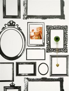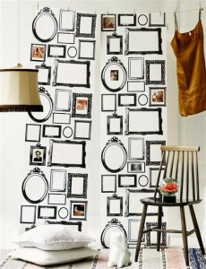 How cute is this?! And what a great idea! I always hesitate to put nails in the walls, and this way, you can get a whole wall of framed art with the help of just some poster tape! Or, if you don’t want to glue it to the wall, hang a panel or two from a wire, like in the picture here. And don’t limit your decorations to just photos, mix it up! Add souvenirs from your travels, ticket stubs, favorite sayings, etc. And if you don’t mind a nail or two through the wallpaper, attach a hook here and there to hang jewelry or memorabilia. (For more from Lisa, see my post about dachshunds and her “Edith” nature wallpaper).